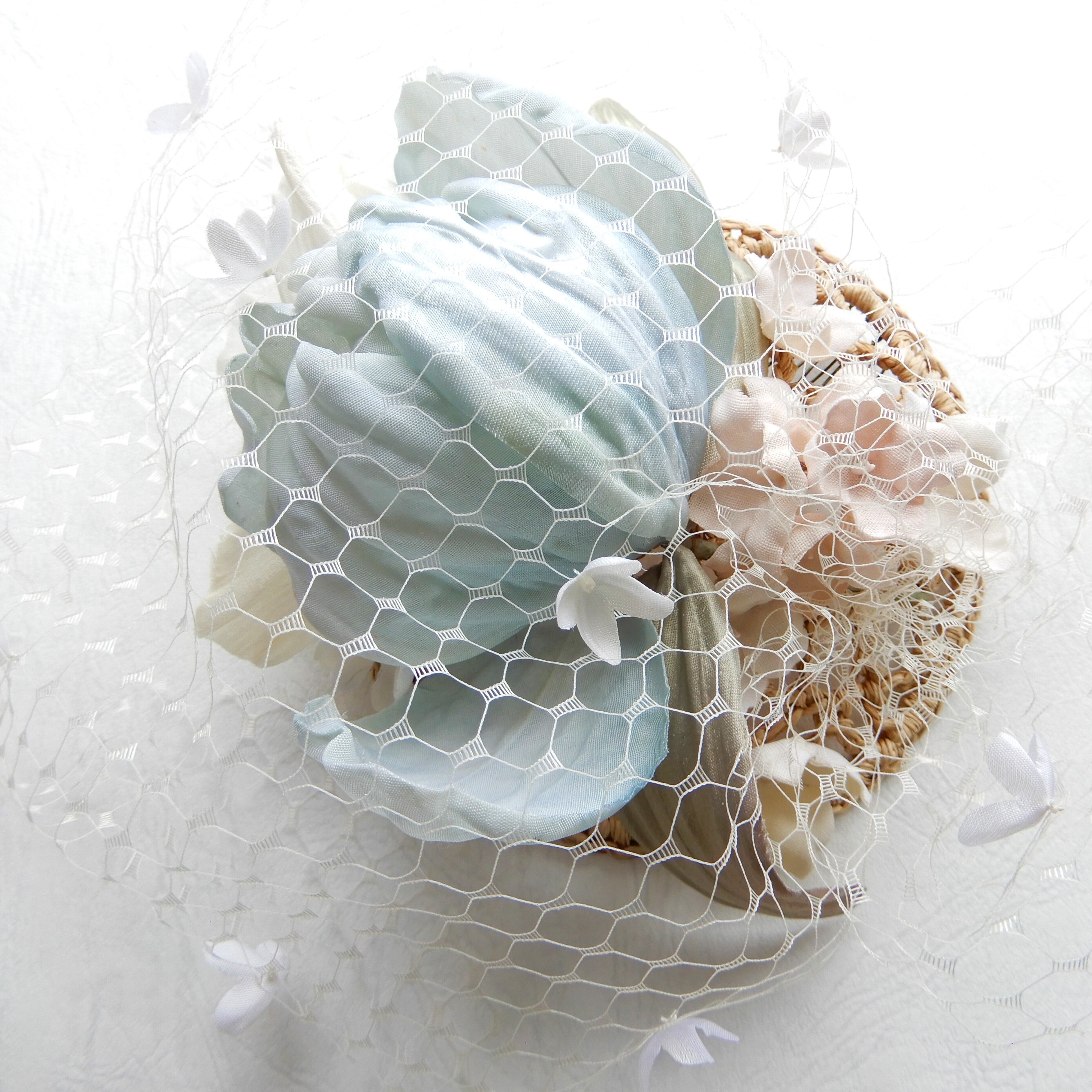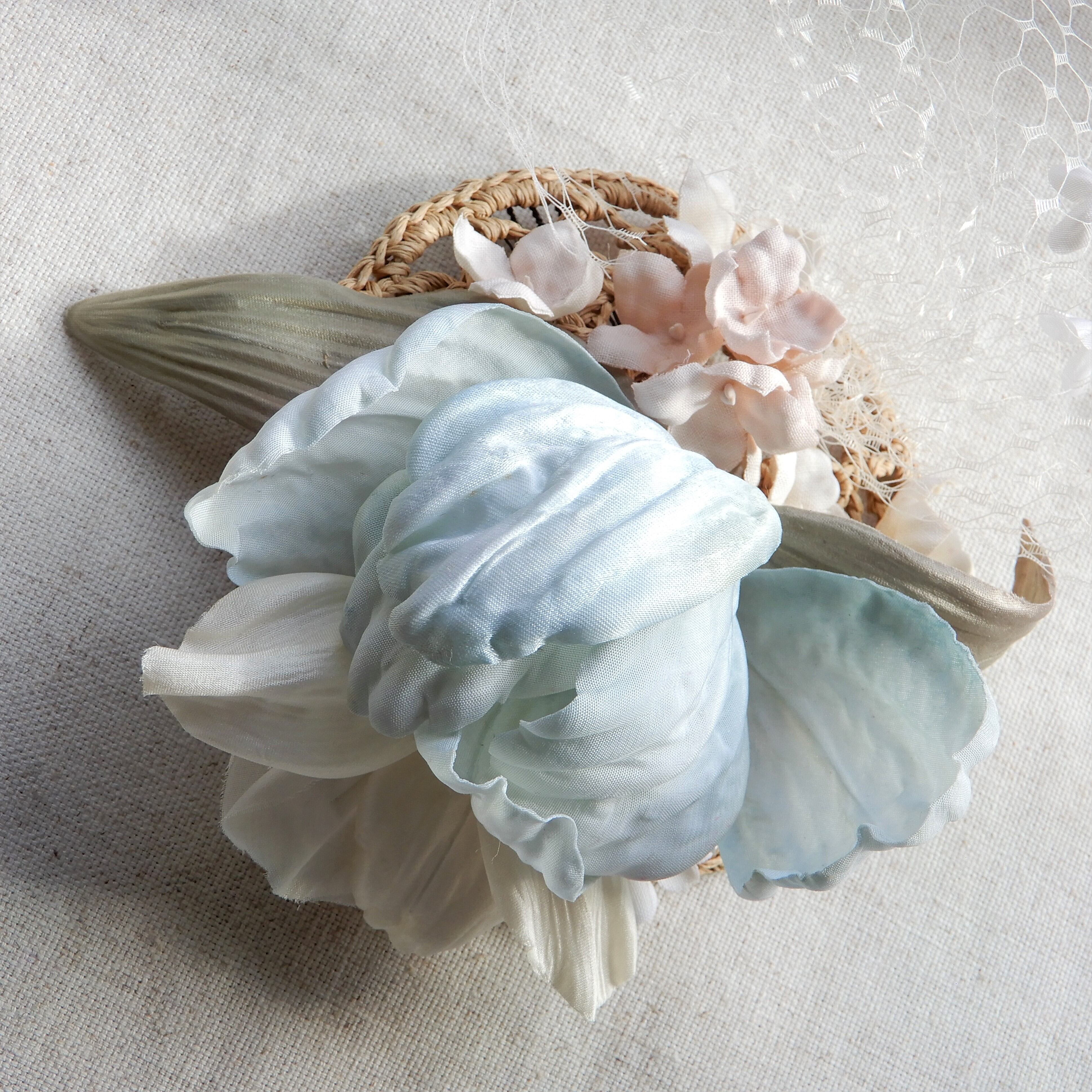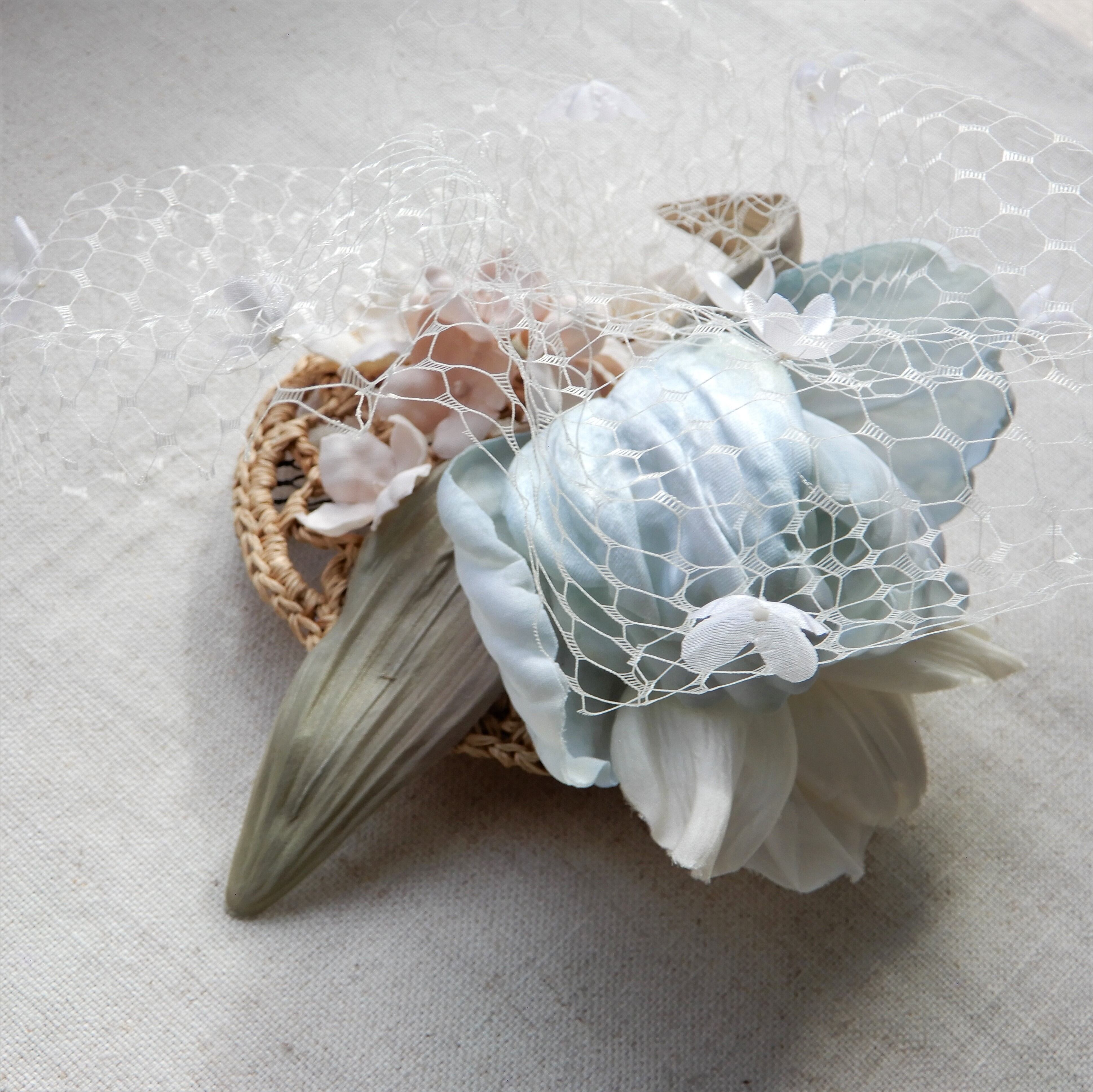 ドライフラワーのような質感とくすみカラーが魅力のブルーポピーのトーク型のヘッドドレス。