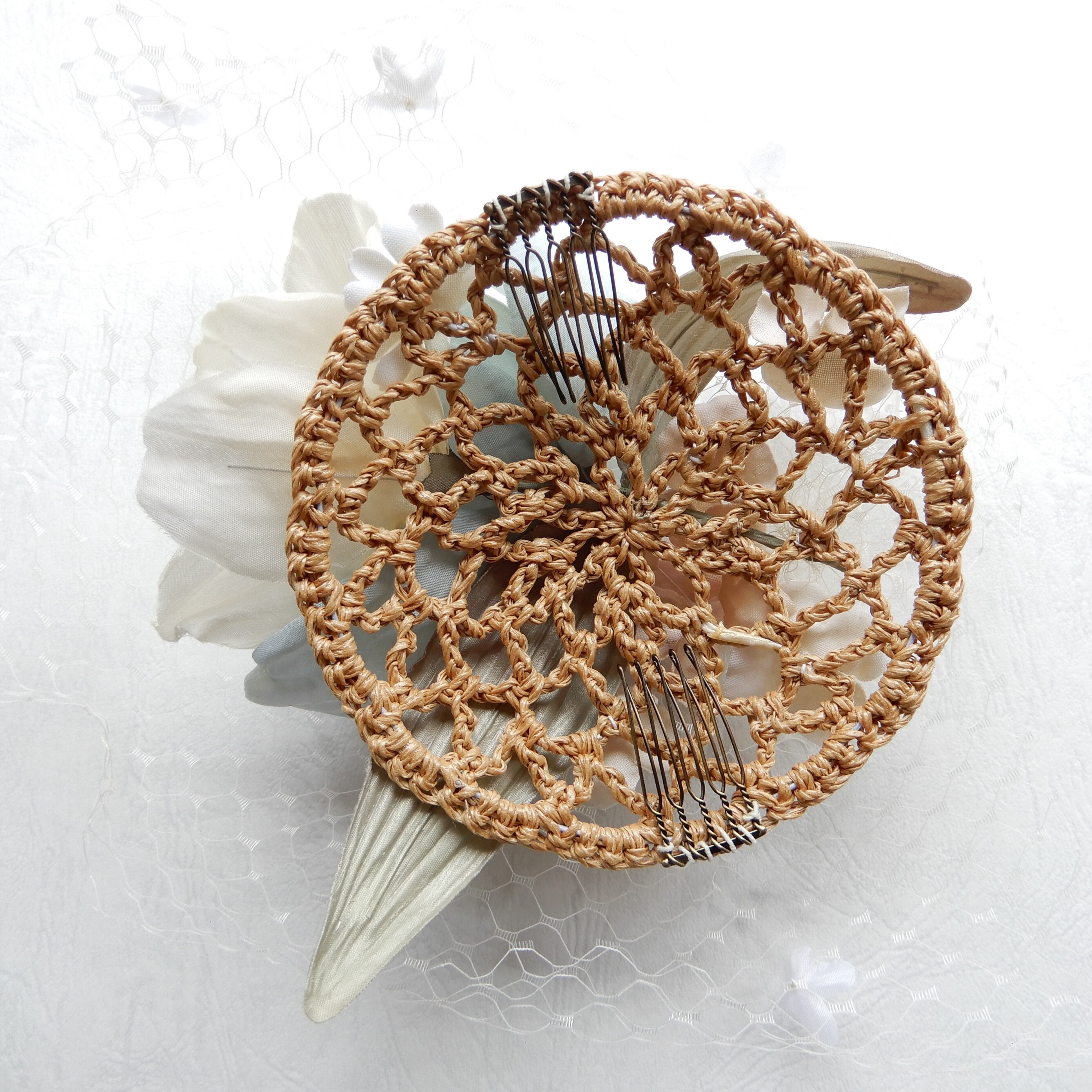 帽体部分は麻の繊維の糸を編み、花々は染色しコテを当て花の形に成型するコサージュの技法で丁寧に作られています。
