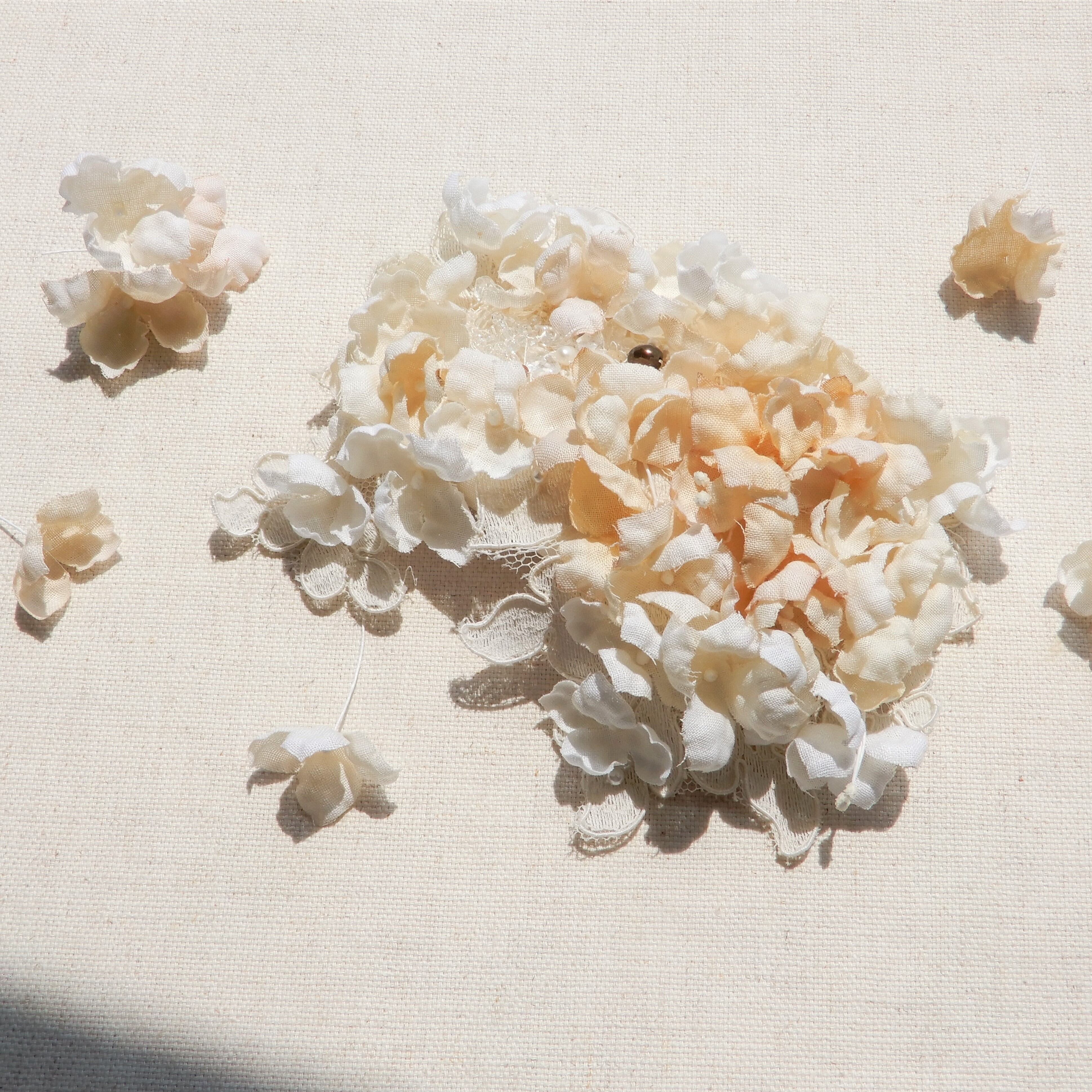 生成のグラデーションに染め上げた満開のアジサイ、アンティークレースや天然石を組み合わせた一点物のボンネです。