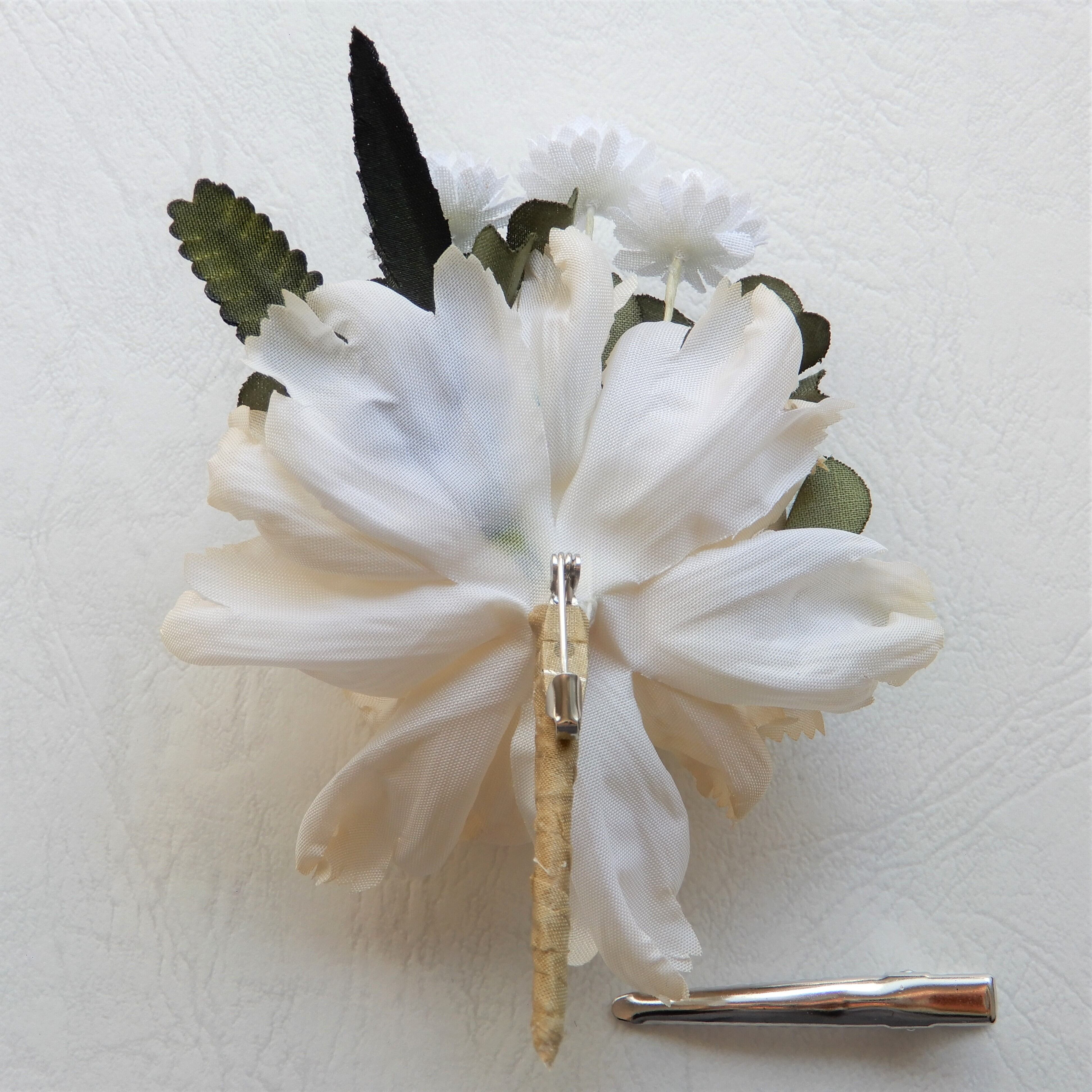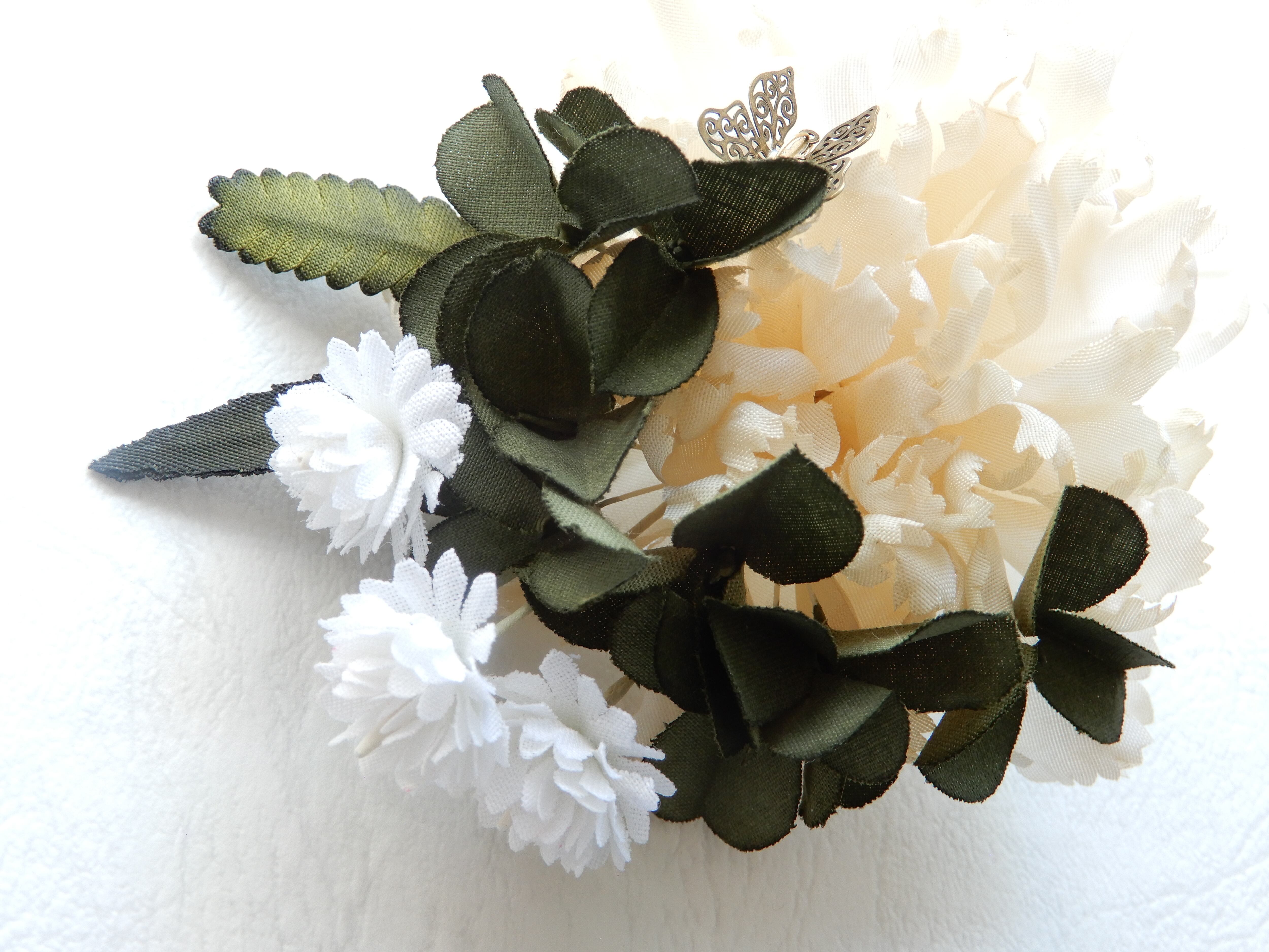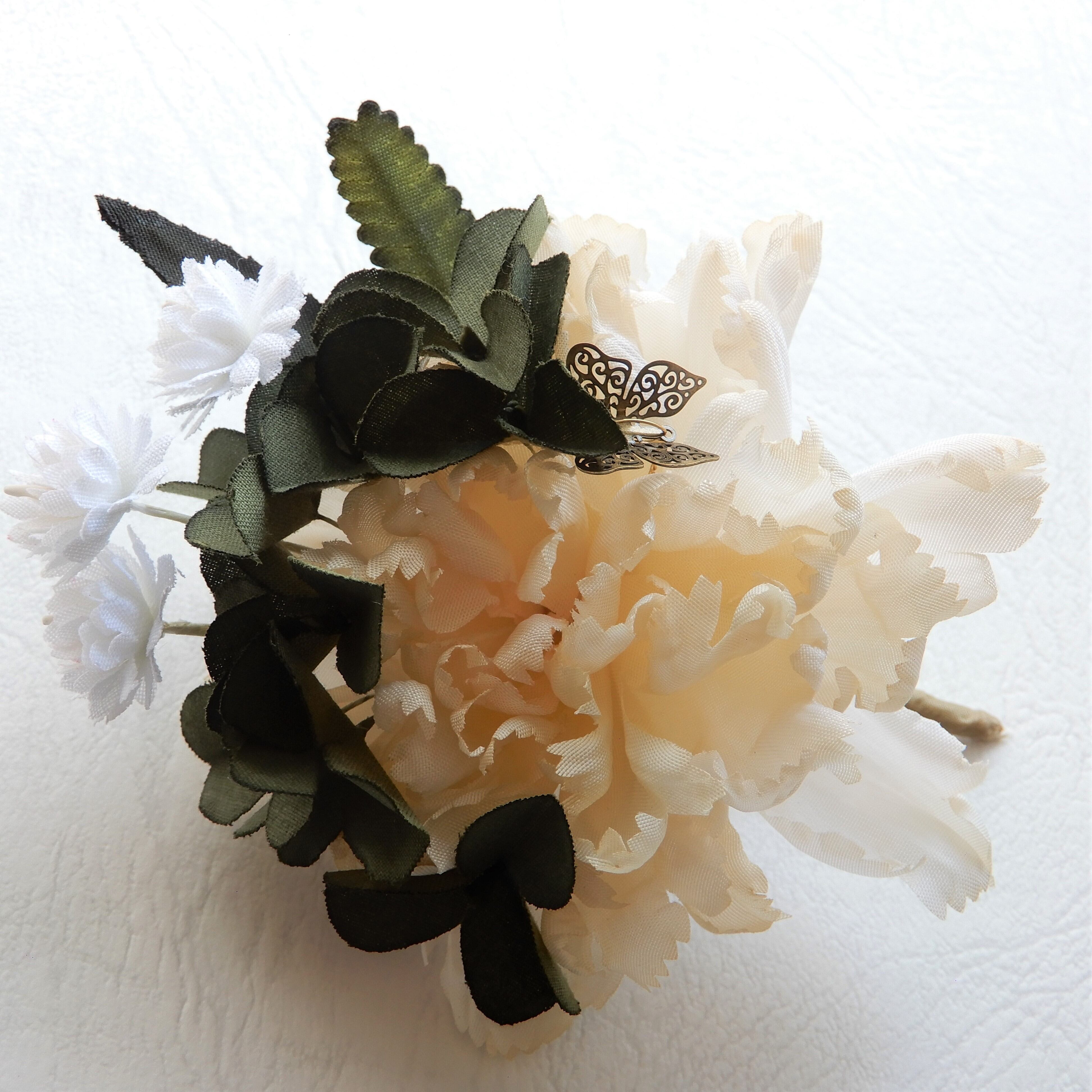 クローバーとカーネーションのミニブーケコサージュは、花々に隠れた蝶のモチーフがポイント。生成と緑の組み合わせは意外にコーディネートしやすい色調です。胸元にコサージュとして、付属のクリップでヘッドアクセサリーとしても使用できます。丁寧に染めあげた草花はコサージュの技法で作られています。入学式や卒業式などセレモニーにおすすめのアイテムです。
