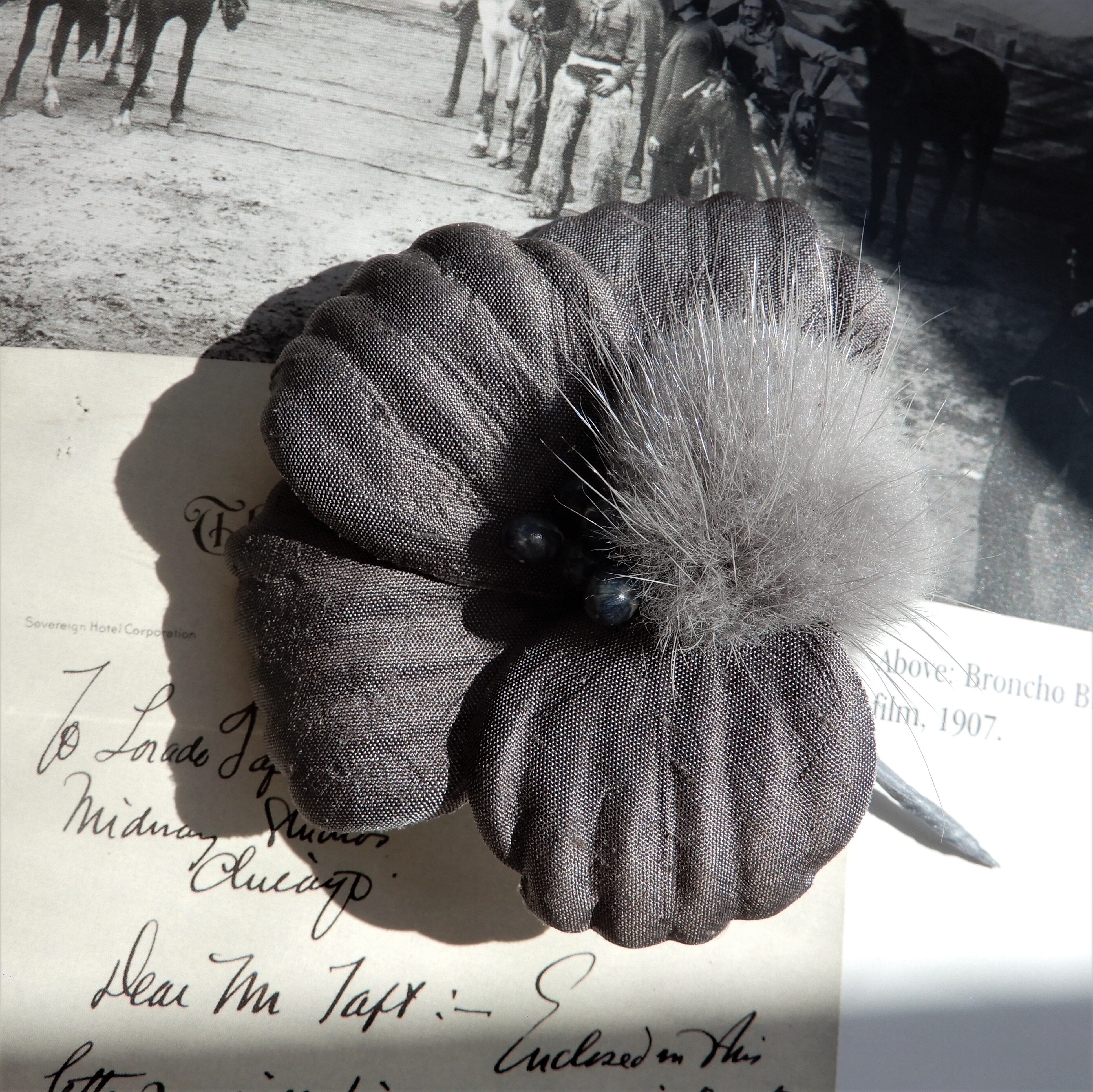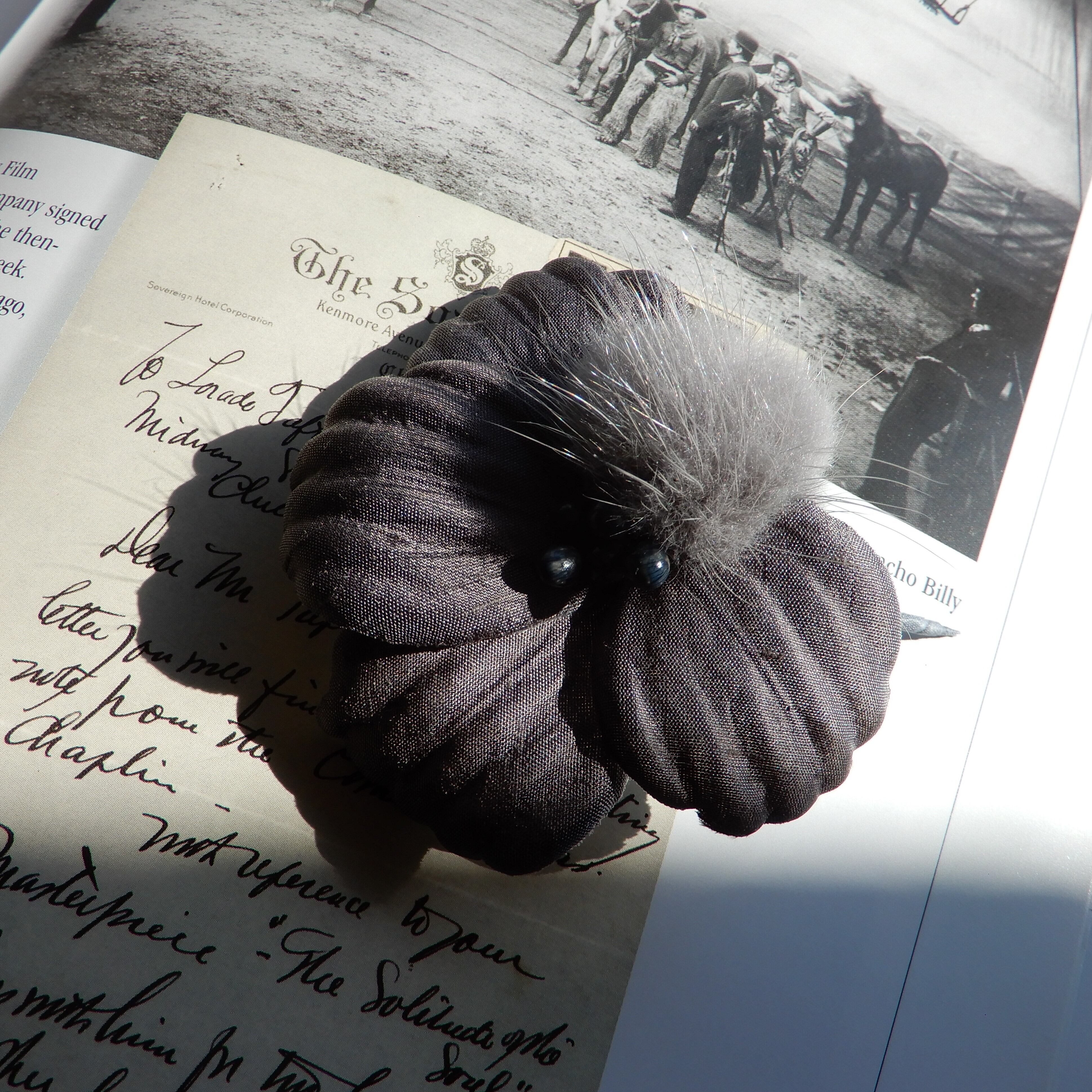 型崩れをふせぐため2枚の生地を貼り、コテをあてたコサージュの技法で作られています。