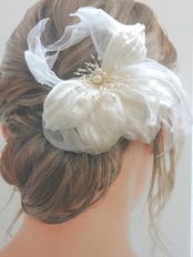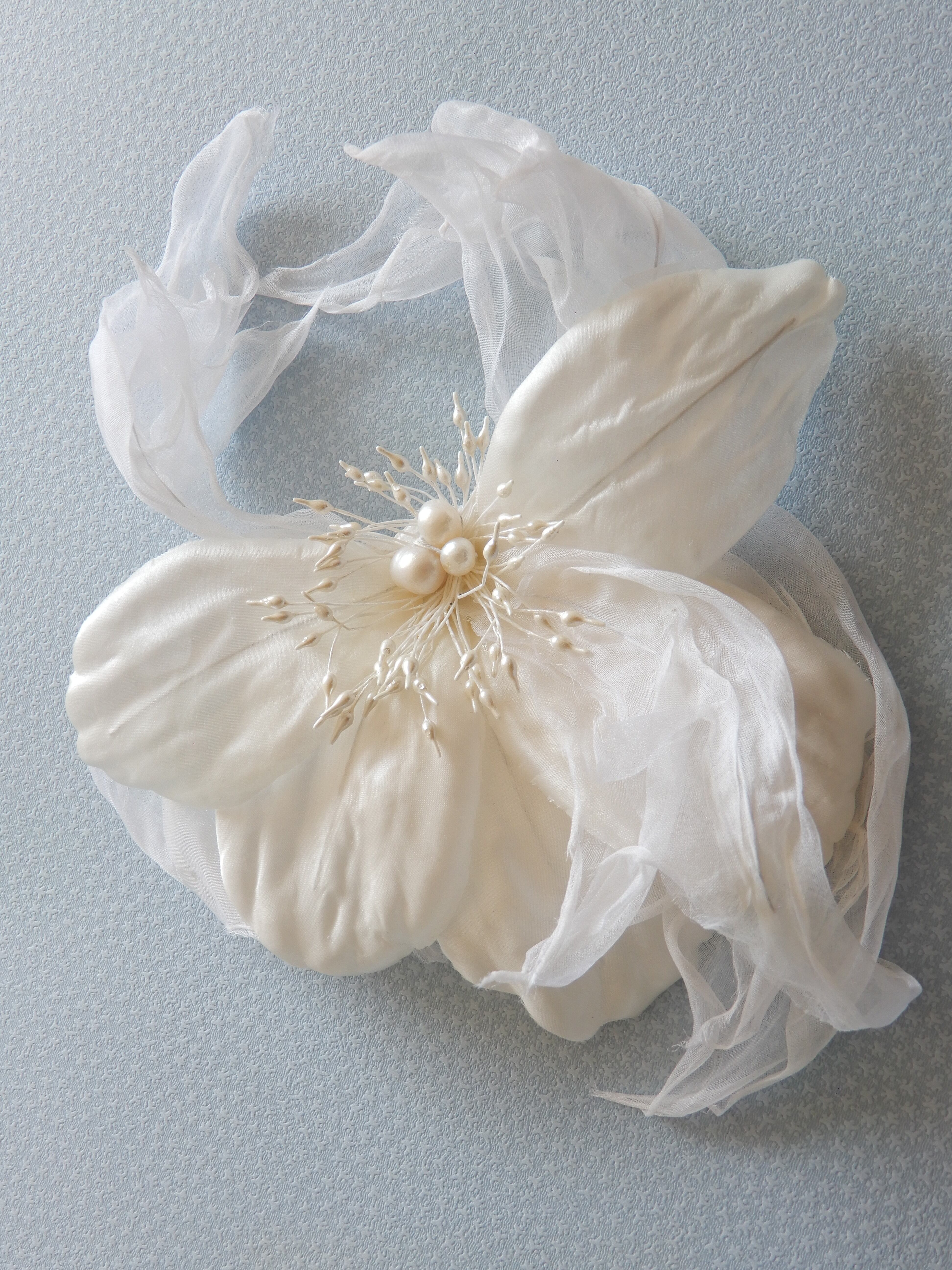 コサージュの技法で作られた大輪のボタンの花をイメージしたヘッドドレス