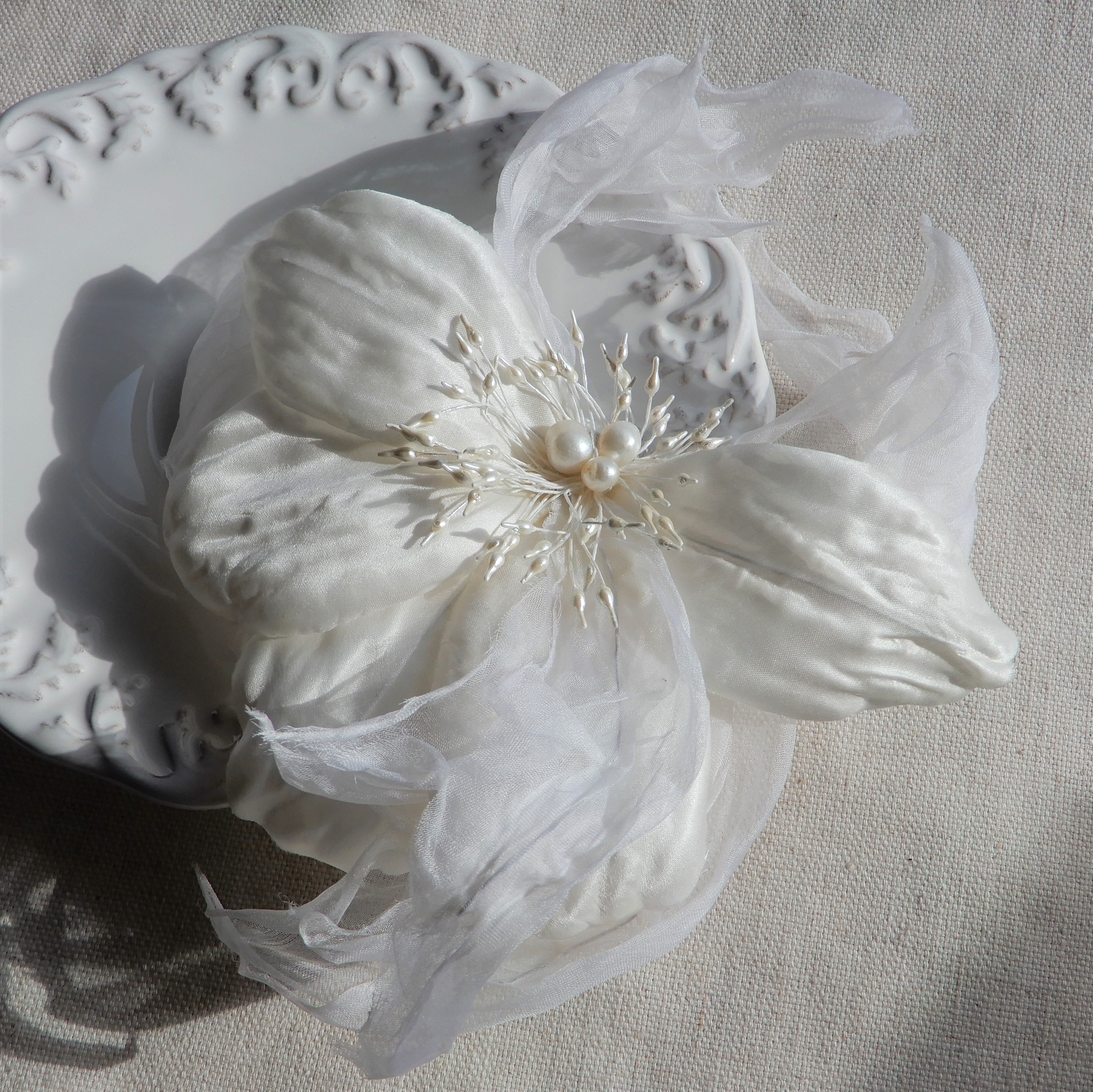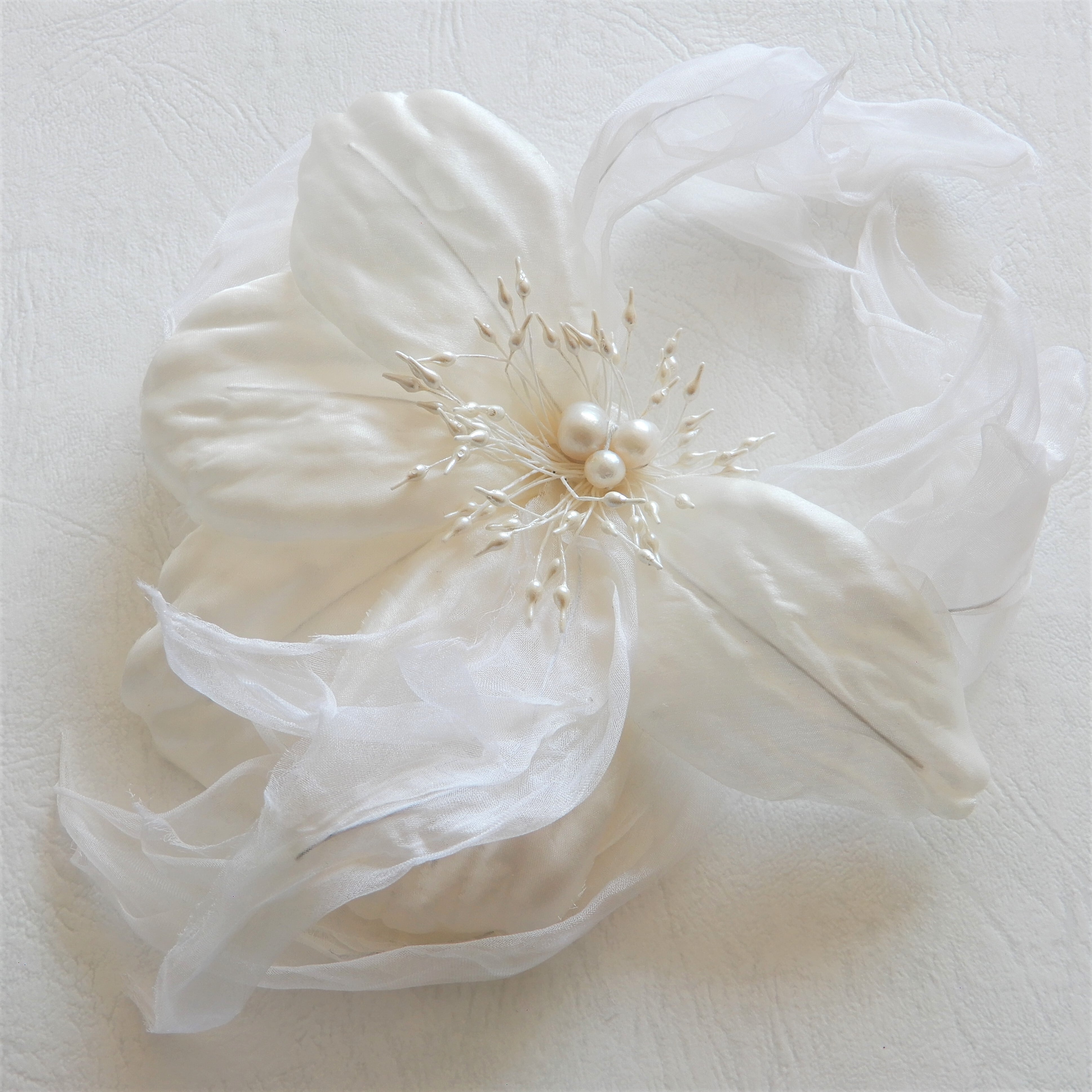 シルクのまばゆい光沢感やオーガンジーのニュアンスのある花弁が幻想的で、生花とは一味違う雰囲気が楽しめます。